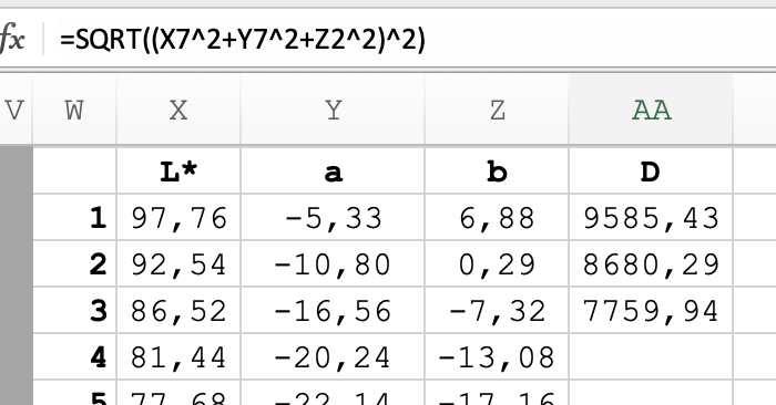 ΔE = √((ΔL)² + (Δa)² + (Δb*)²)