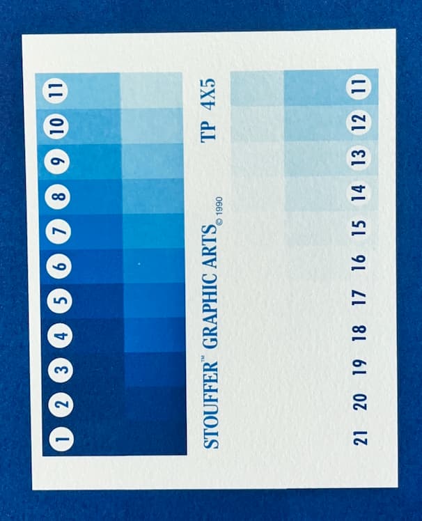 Let’s say for an example that the Stouffer indicates an exposure of 10 minutes. You could then switch to cutting a strip of OHB and taping it to the sensitized media - and start your exposure at 8 minute, then add 20 seconds each time, covering up a small part of what was previously exposed. So perhaps you have 8 min, 8:20, 8:40, 9:00, 9:20, 9:40, 10:00, 10:20, 10:40, 11:00, 11:20, 11:40