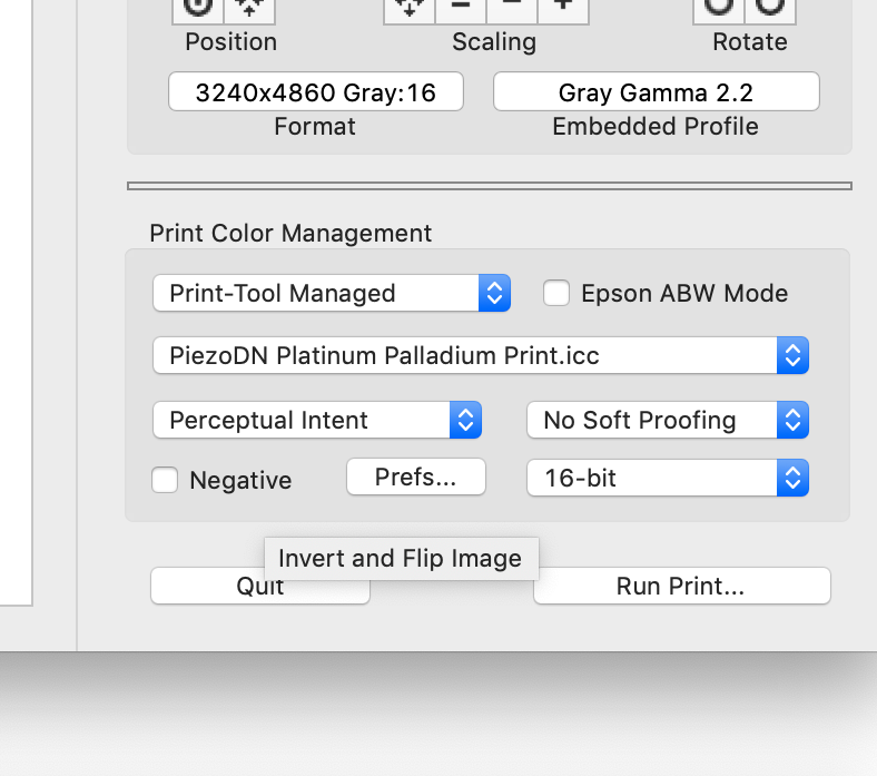 Regarding the Pt/Pd icc, I didn’t use it until recently as I would just soft proof in PS (on a PC). I did print out a carbon neg with and without the icc in Print Tool. It made absolutely no difference to the problem at hand. If I remember correctly Walker had said this icc should be close enough if I wanted to incorporate it into my print tool workflow. (I haven’t decided what my preference is when actually making the print, but that is another issue.)