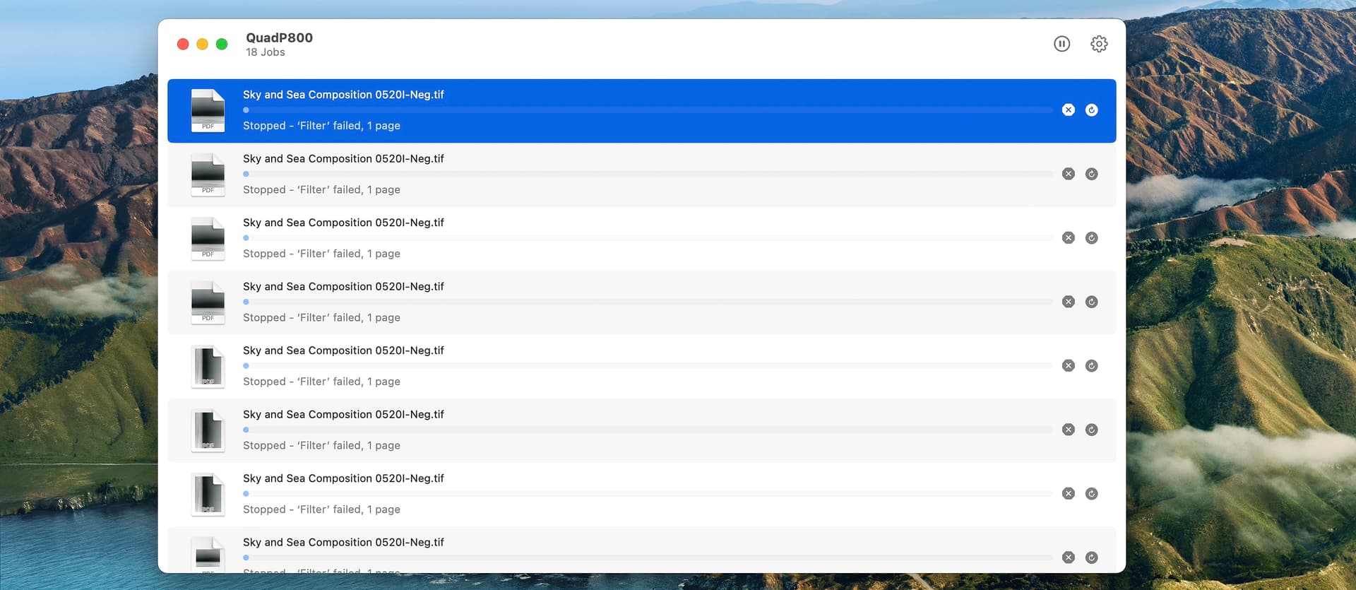 I’m attempting to print a 51 step target. The Epson Driver QUE is showing the printer as “Stopped - Filter Failed”. I have re-installed PrintTool, QTR, and deleted and re-installed the printer. Corrected names of several .quad curves, and re-installed everything again. Still get the same error.