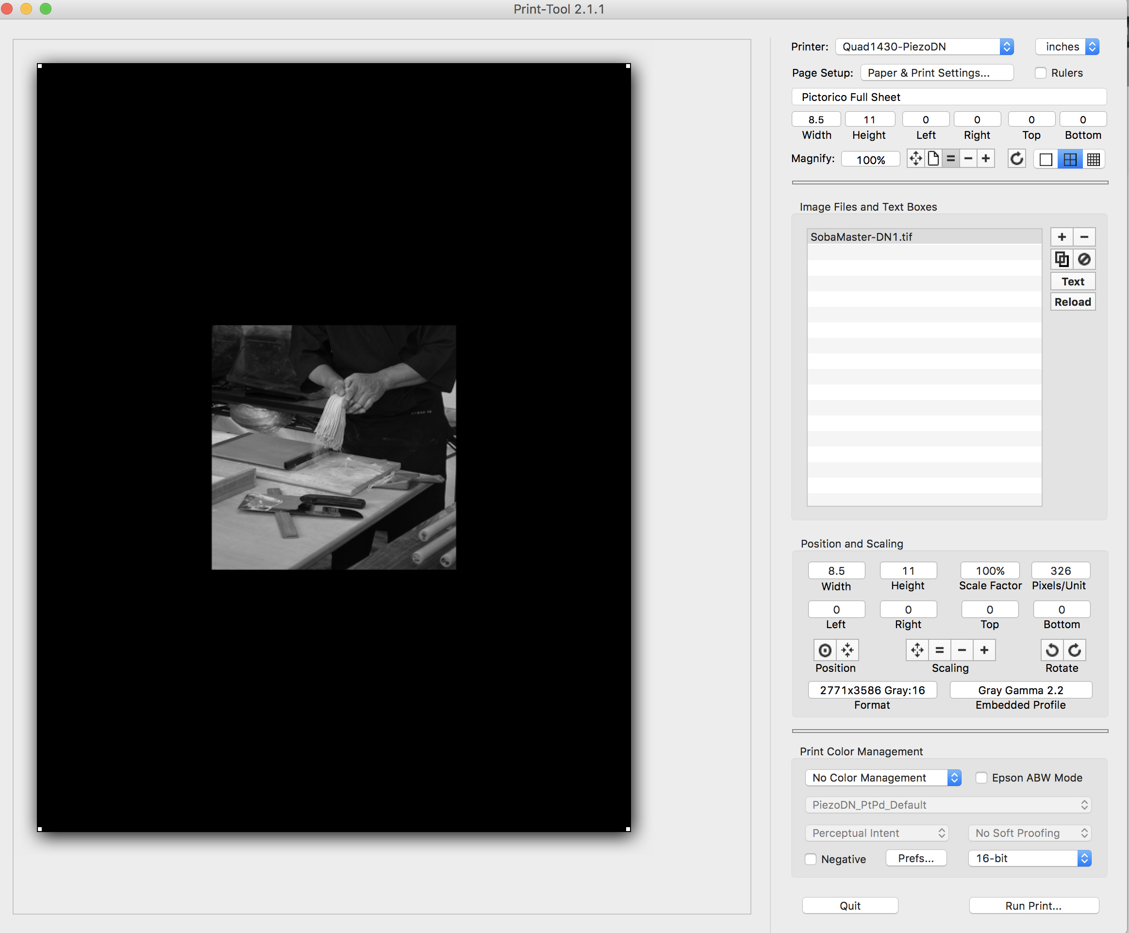 OK. We’re making progress! I uninstalled and reinstalled QTR+Print Tool and then set up a PT preset with the appropriate PiezoDN curve, to let PT flip the image horizontally, and the other settings as directed.