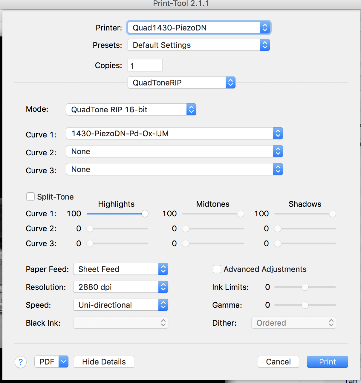 Reinstalling Print Tool is probably not a bad idea, but what Walker and I have suggested is to reinstall the QuadToneRIP application itself since that is where something seems to have gotten corrupted. Then reinstall the 1430-PiezoDN printer from Applications>Piezography>Curves>1430-PiezoDN.