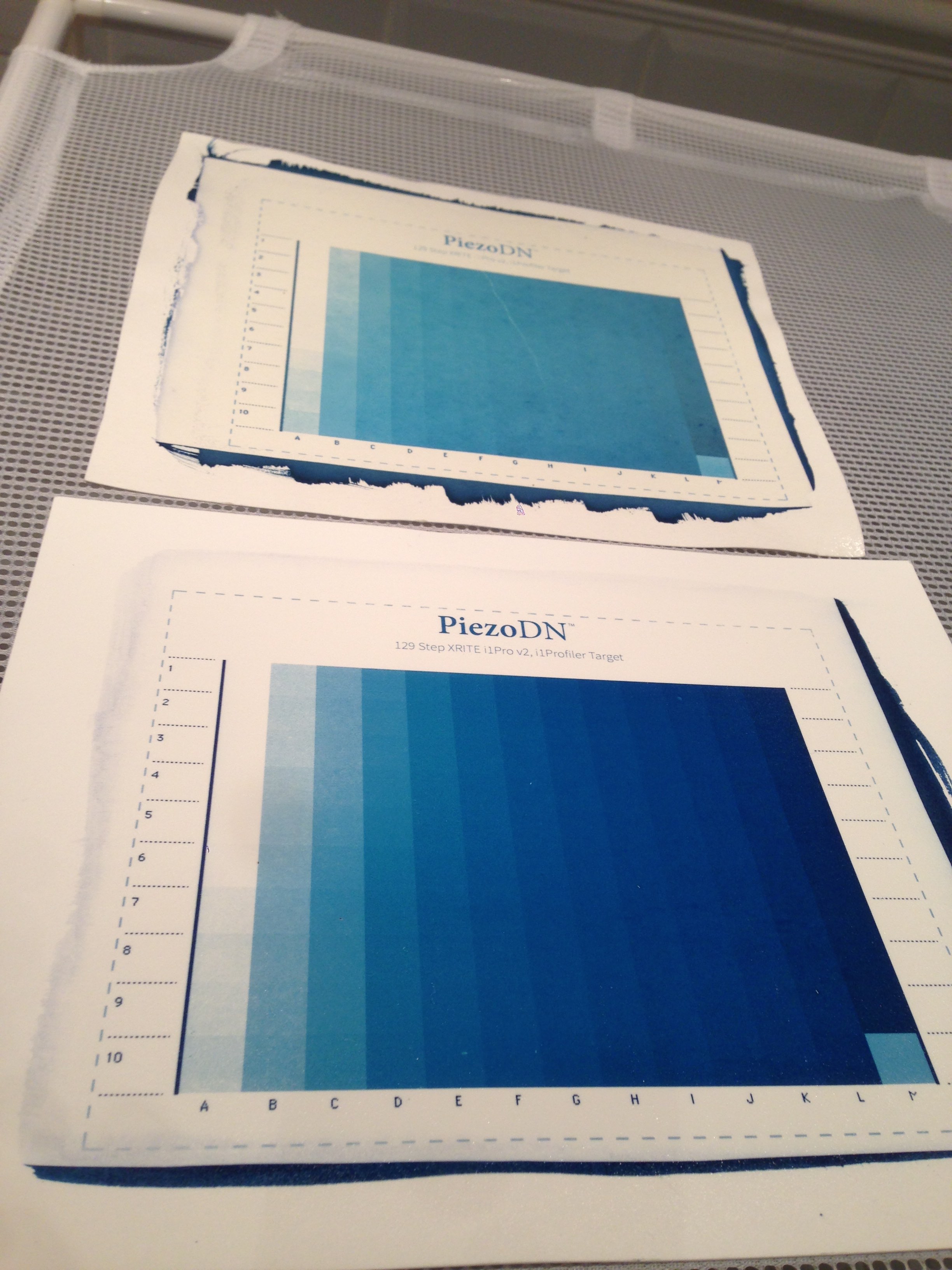 The Hahnemühle chart is looking good but the Ruscombe paper is looking very faded, blotchy and has very little contrast (it also has a nasty crease that my vacuum frame seems to be adding