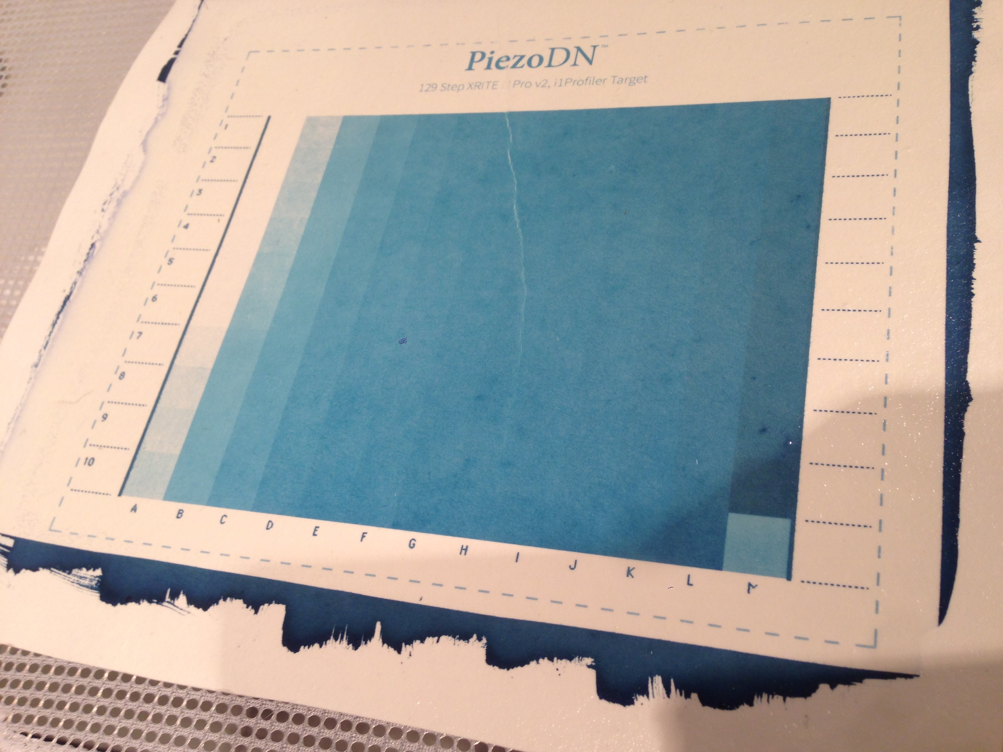 Also, looking at the exposed outer edge, you didn’t reach Dmax under the film. It looks to me like you need to double the exposure time. Don’t assume that an exposure time for one paper will be the same for any other paper. Last fall I did a bunch of testing with Ware’s New Cyanotype formula and found a range of exposure times from 3-12 minutes among the 12 papers I tested. Herschel was one of the fastest, but if you are using the classic formula that has no bearing. I should note that I was using a 4x5 21-step Stouffer tablet, not PiezoDN or any other digital negative.
