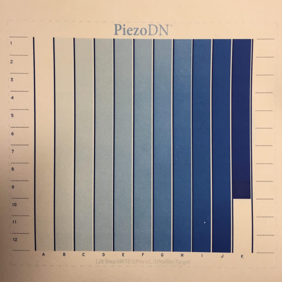 I printed the iProfiler target: PiezoDN-129step-i1Pro1.tif. The printed target is attached. Looks to be on track.