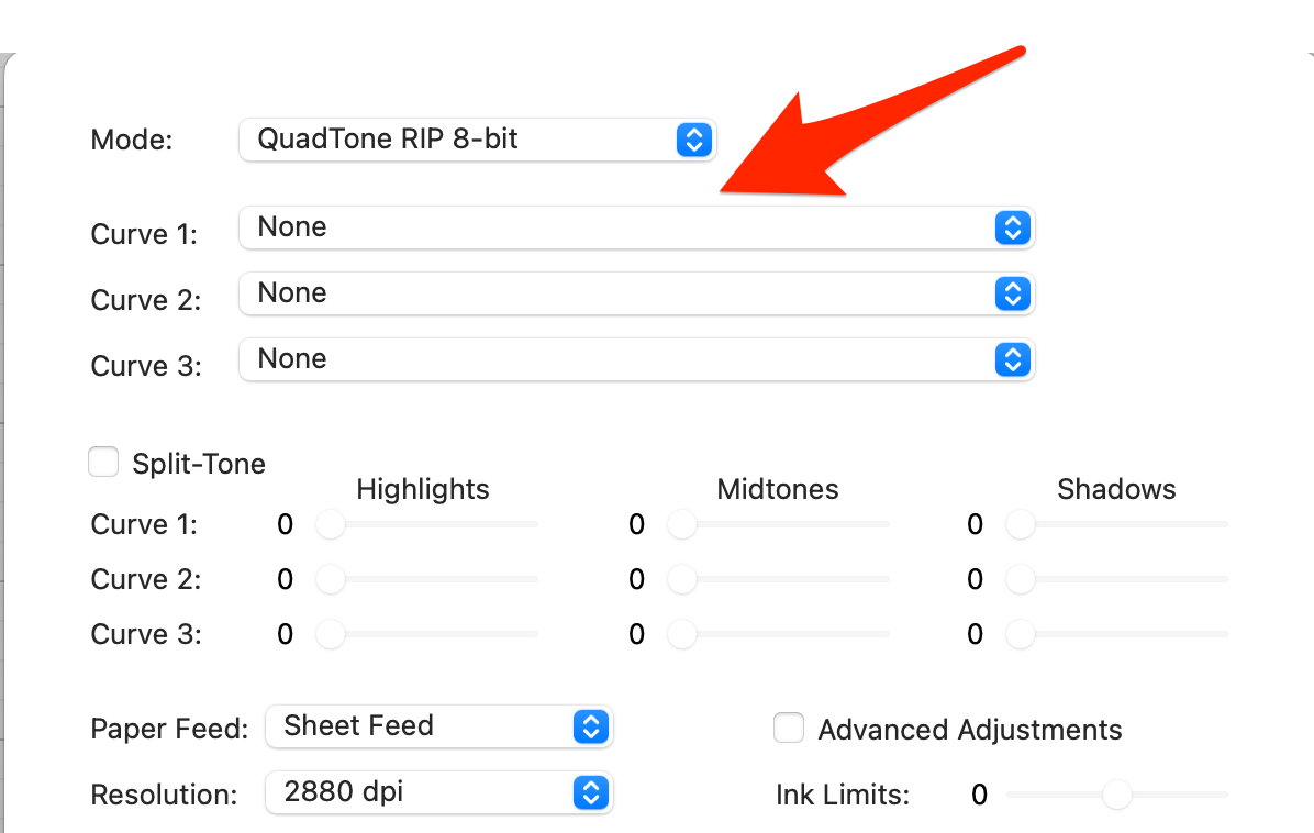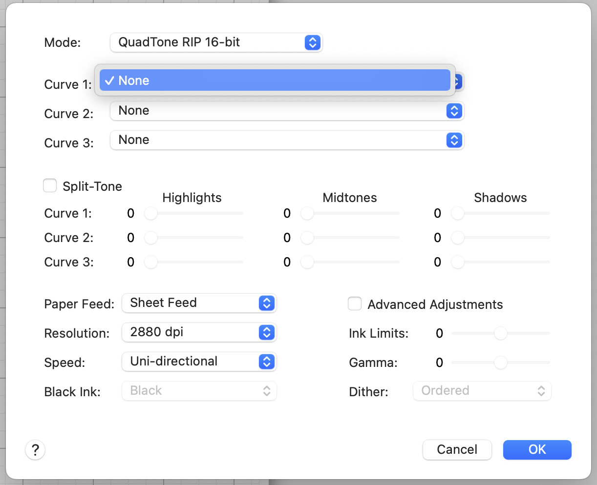 It is option #3. You get further than I do though. All I get is the name QuadToneRip and none of the curve options appear. The first image shows my attempt on an older computer with the OS just before Monterey. The second image is from my laptop running Sonoma. (I tried a second computer just to trouble shoot. It got further and brings up options but the curves drop down is empty.