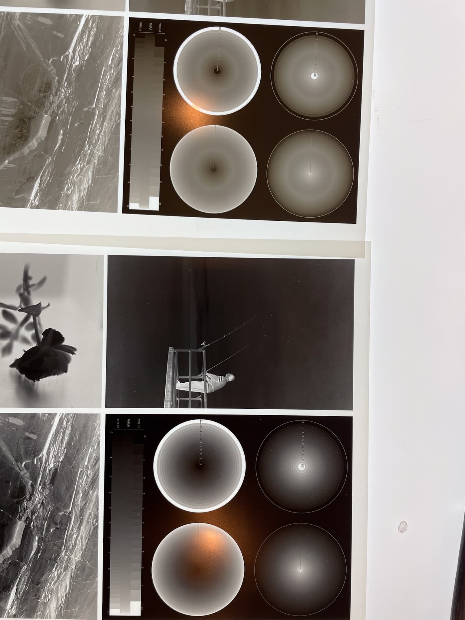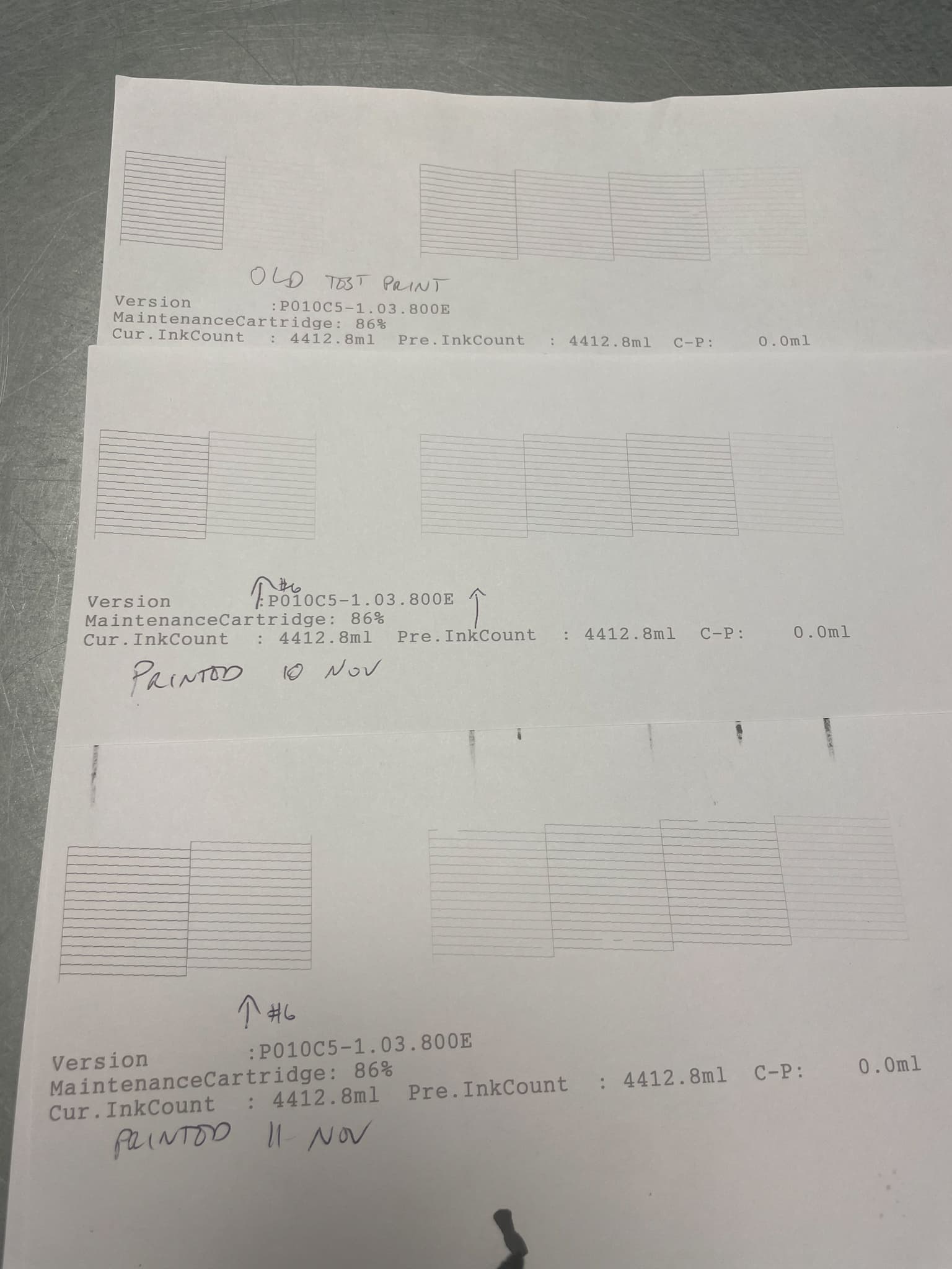 Then I printed out a nozzle check and I could see that shade 6 was darkening and shade 2 was lightening. I tried to flush some ink through the line and both channels kept shifting in the wrong direction. The image shows (from top to bottom) an old nozzle check, my nozzle check from monday, and my nozzle check from today.