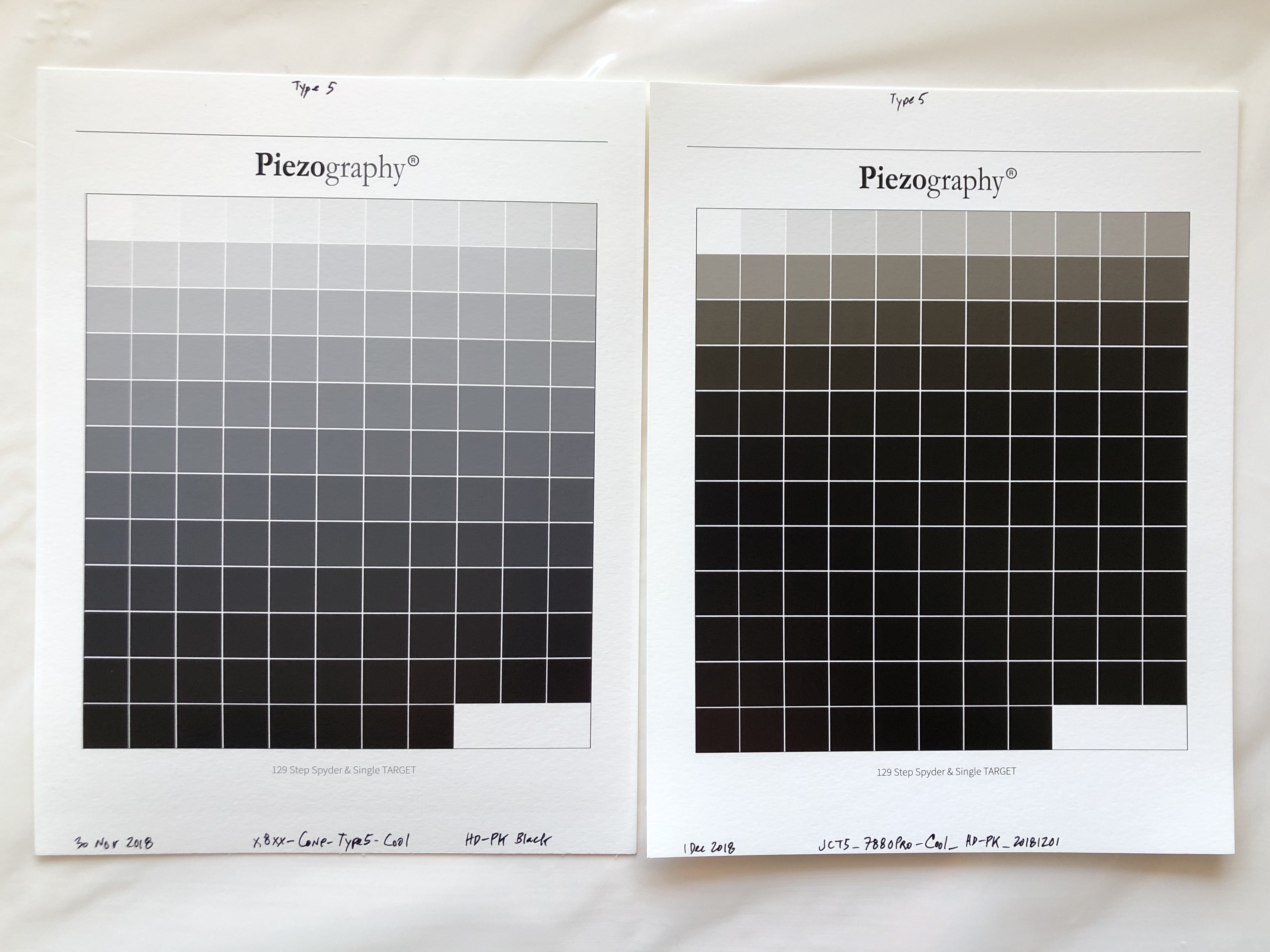 The image on the left is the 129 Spyder target printed on Type5 paper using the x8xx-Cone-Type5-Cool curve. The image on the right is the same 129 Spyder target printed on type5 paper using the linearized curve (JCT5_7880Pro-Cool_HD-PK_20181201); this curve has not yet been measured. The linearized .quad was built using PPTool v2.0.3. Printer is 7880, Pro inks installed w/ HD-PK and GCO.