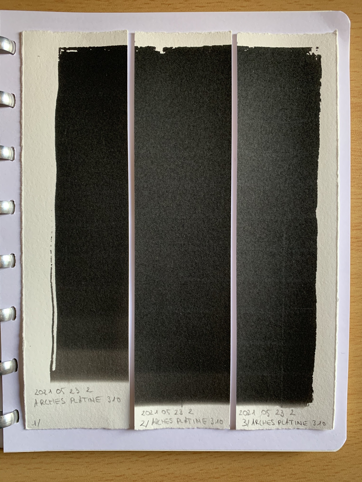 I’ve made test strips (Platine Arches 310 // Malde-Ware Method 2 50-50 Pt/Pd) to obtain the Base Expousre Time (Chapter 7 as per above mentioned book). I’ve used a glass rod aswell a humidity box.