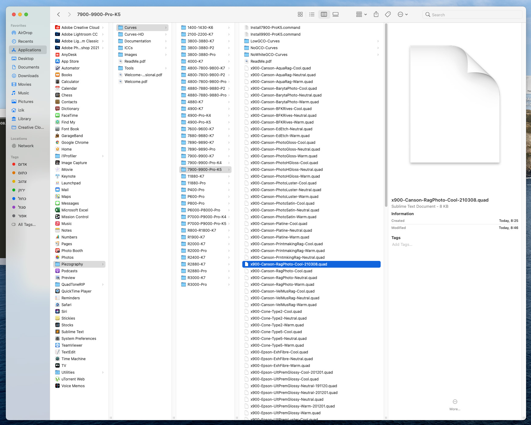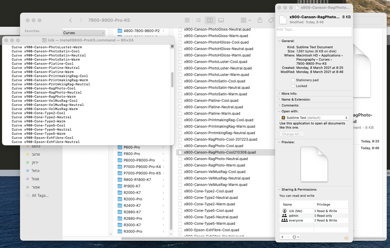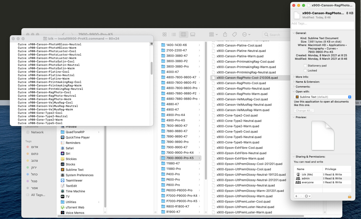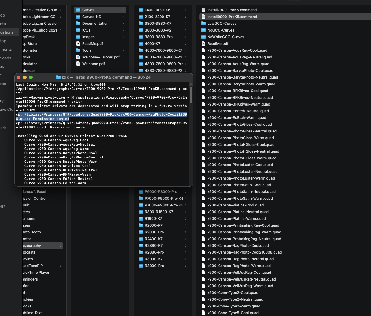 I built a new curve .QUAD using Piezography PRO and saved it into the Piezography/Curves/7900 9900 proK4 (see attached screenshot) but when I run the install9900 ProK4 command it refuses to take it into account, the curve does not appear in the Print Tool Quad Tone Rip and hence I can’t print with it. Any idea why the install command refuses to take the curve into account? Thanks!