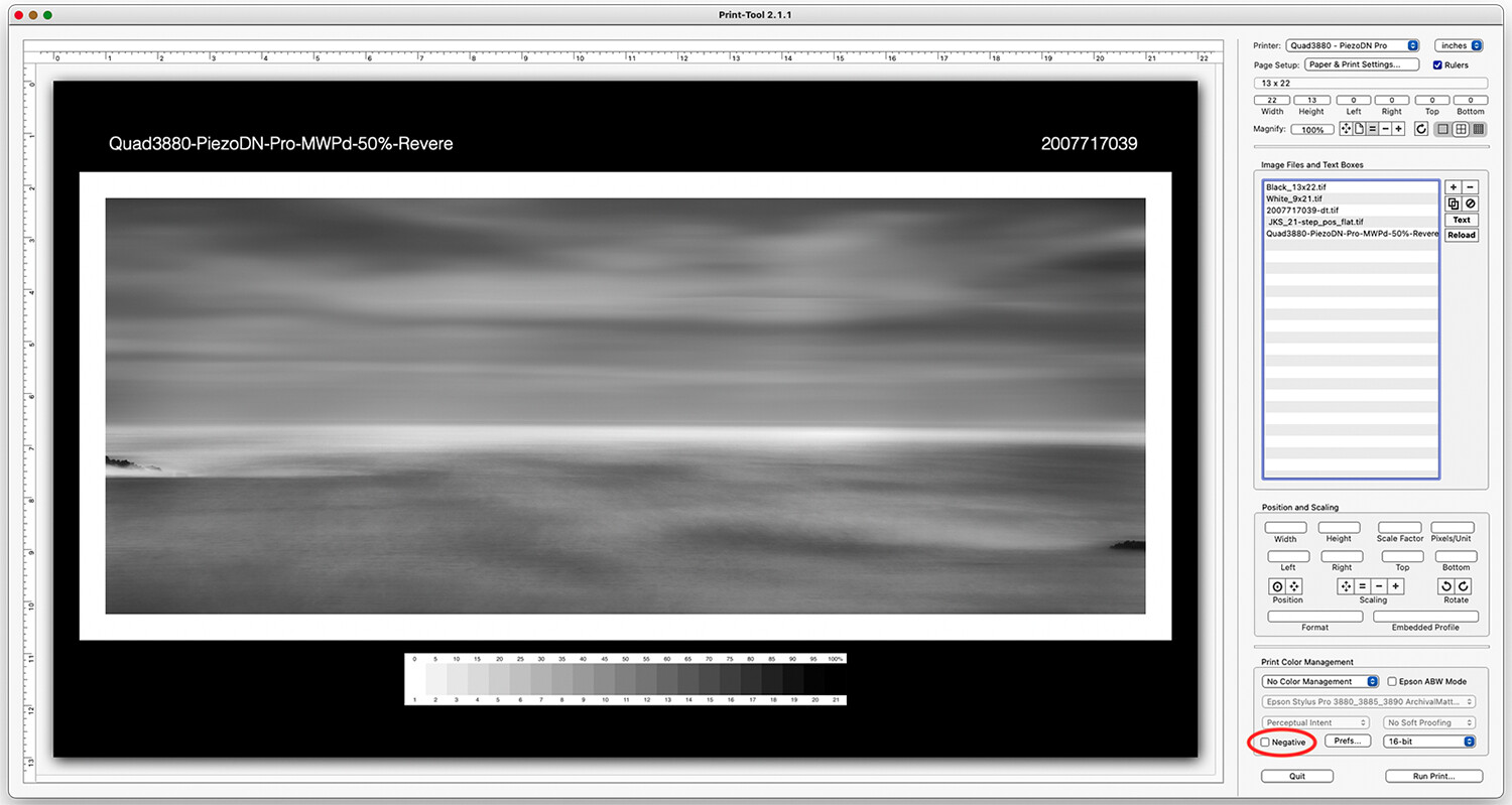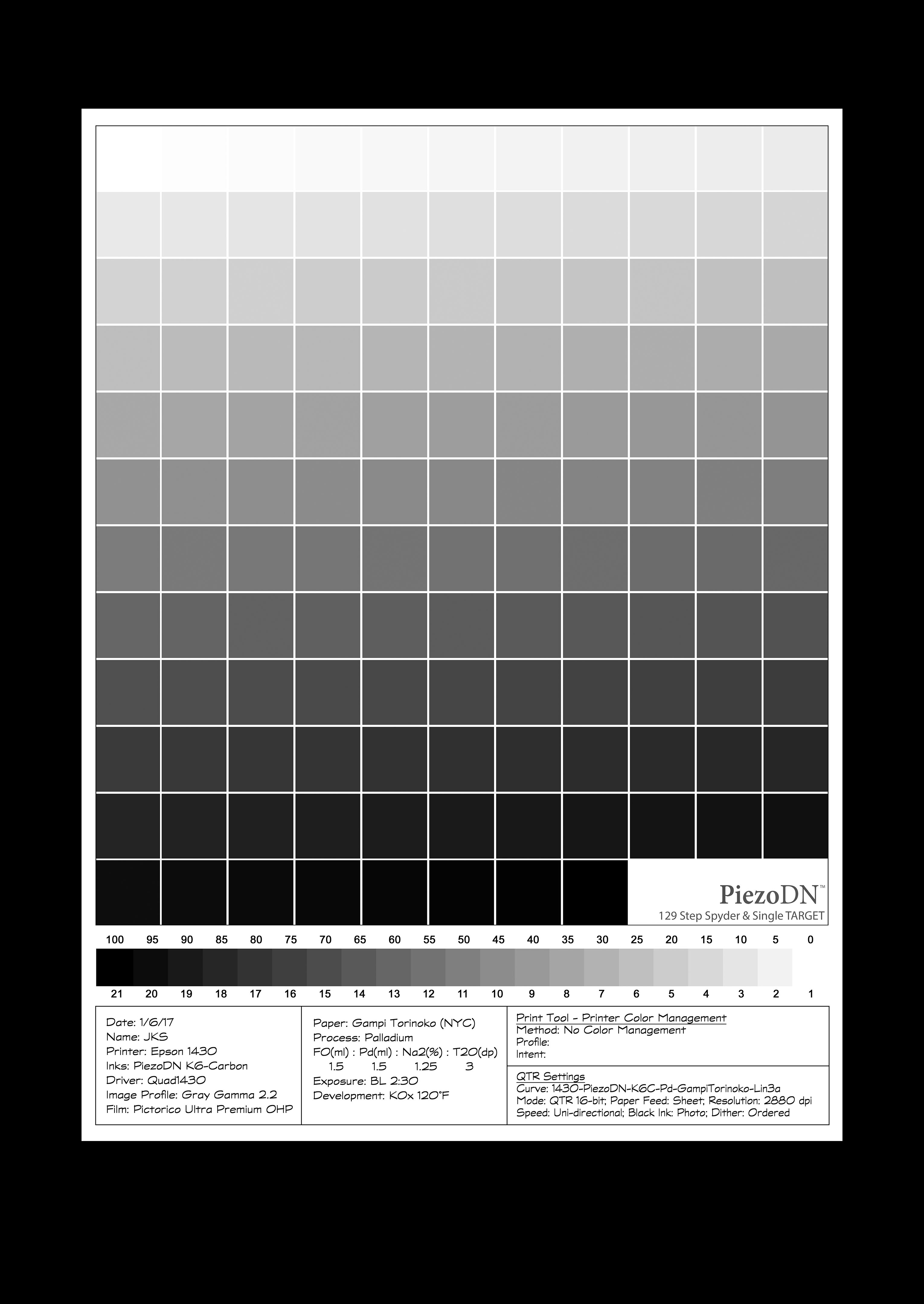 When I print a target using Print-Tool (say 129step-Spyder.tif), how do I prevent the surrounding canvas from being printed in black? I usually trim my negatives (or mask them with Rubylith) before making a contact print, so the black canvas just wastes ink. The Print-Tool “Prefs” button offers white and black backgrounds, but these are ignored unless “Negative” is checked, and I understand that it is never appropriate to check “Negative” when printing with Piezography quads. Is the only alternative to open the target in Photoshop and add a black canvas? Sorry for the elementary question, I’m new to Print-Tool.