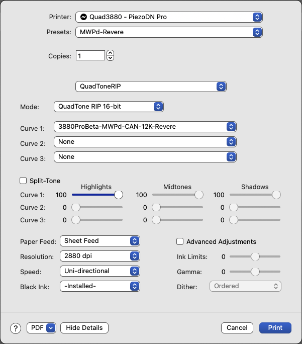 Since you are new to Mac and Print-Tool, I think it bears repeating that you will NOT be using Print-Tool’s Negative feature (circled in red above) when making PiezoDN negatives. This is because the inversion from positive to negative is accomplished by the PiezoDN quad curve itself. In addition, you do not need to flip the canvas in Ps since you can do that by selecting Flip horizontally from the Print Layout dialog and save that option as part of a Preset along with the QuadToneRIP settings.