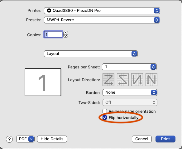 - Note that the image can be right-reading. Flip horizontally can be selected and saved as part of a Preset in Print-Tool.