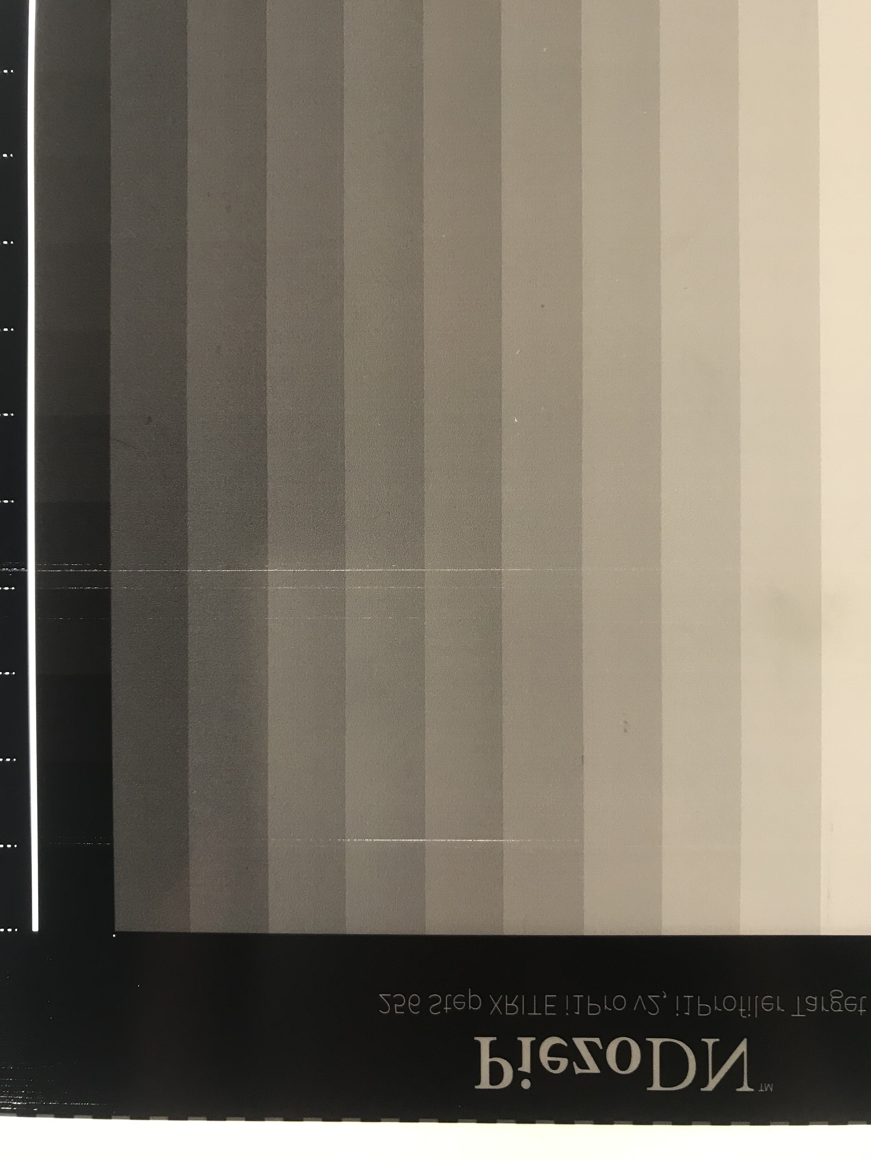 So, we’ve taped two pieces of glossy paper measuring 2x8.5 inches on each end of the Pictorico, created a canvas size of 8.5x 15 inches and we’ve eliminated the star wheel issue but now have these random gash lines running perpendicular to the paper feed axis.