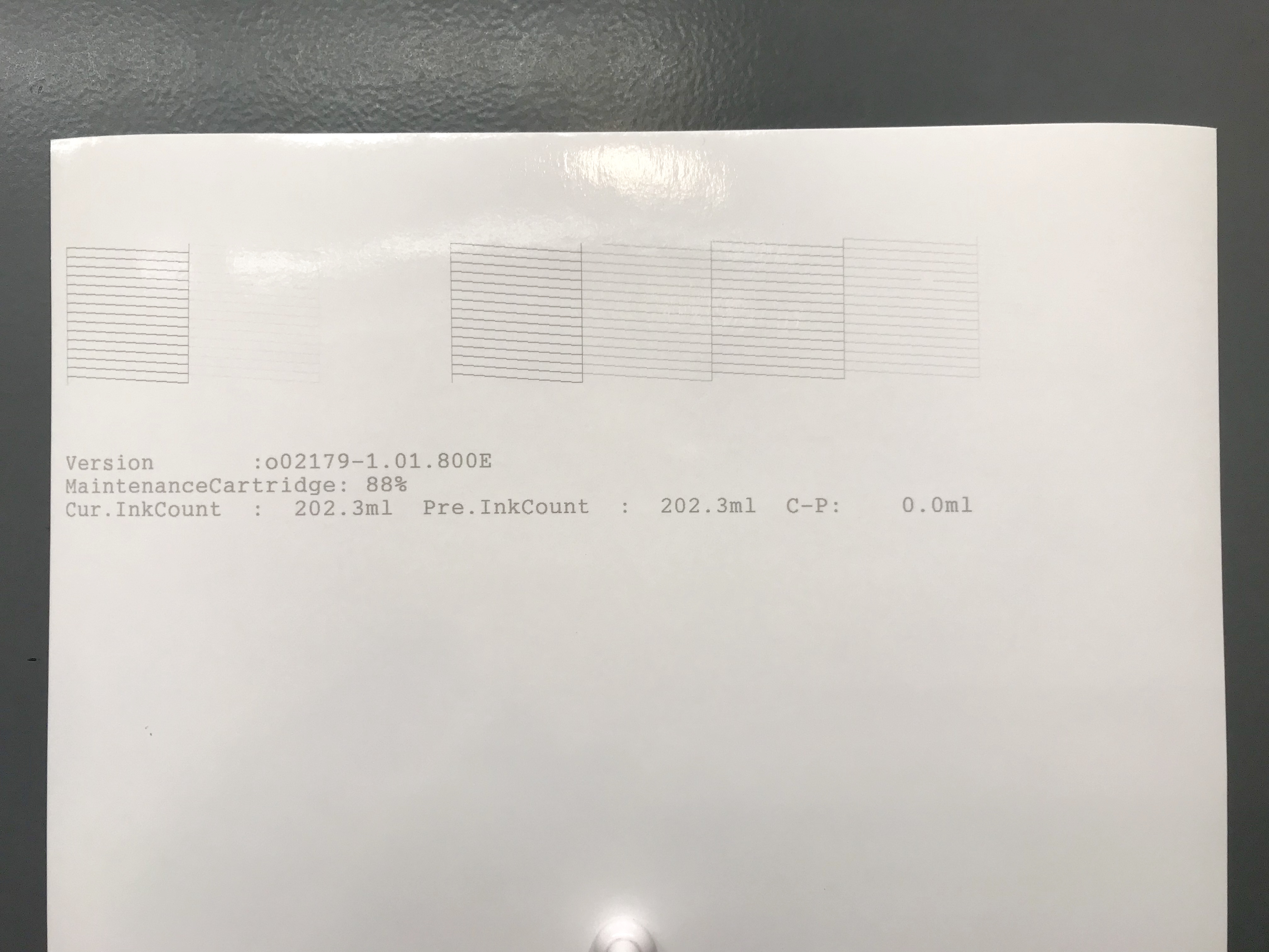 All seven shades and the GO are in the correct positions. It’s really hard to see shade 7 in the yellow position in this photo. There are a few nozzles missing here and there… You can easily see shade 7 when you run a Calibration Mode test (in the manual). But, from what I can see the inks are properly placed.