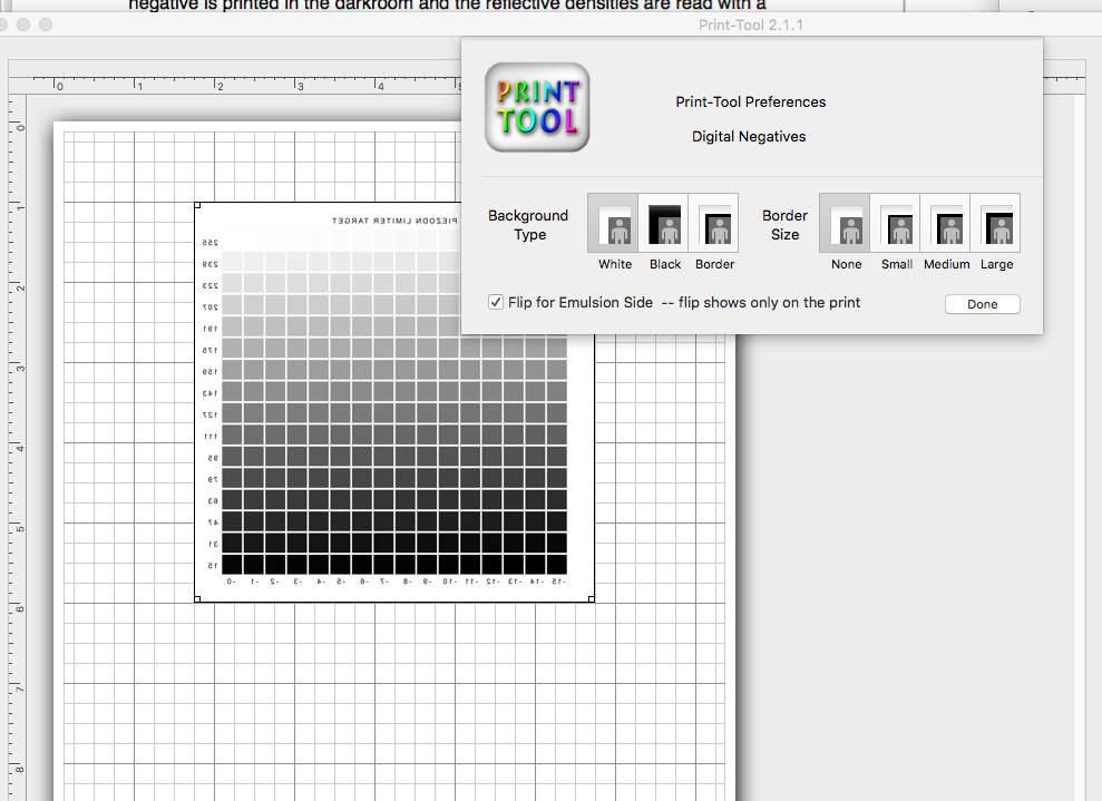 If I may add to Walker’s reply, do not use Print-Tool’s negative preference features with PiezoDN - they will not behave as intended since they are made for use with standard methods of making digital negatives in which a negative image is sent to the printer. With PiezoDN the quad curve performs the inversion which is why a black border is necessary in order to get a clear (un-inked) margin on film.