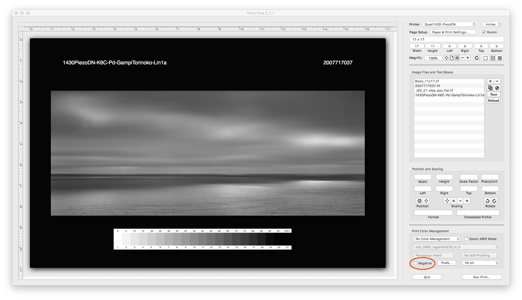Note the 4 layers in the Image Files and Text Boxes area. Only the top 2, black background and image, are necessary to print a negative with a clear film edge and no mask. The text and 21-step strip are things I find useful. Also note that the Negative box (circled in red) is not checked. This means that the Negative Preferences function is not active. This is important.