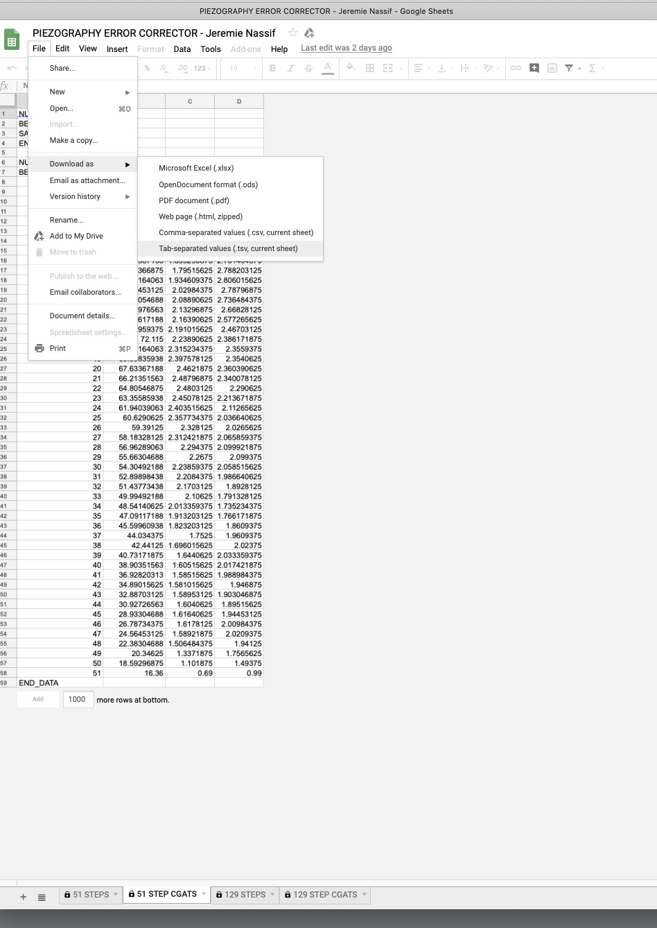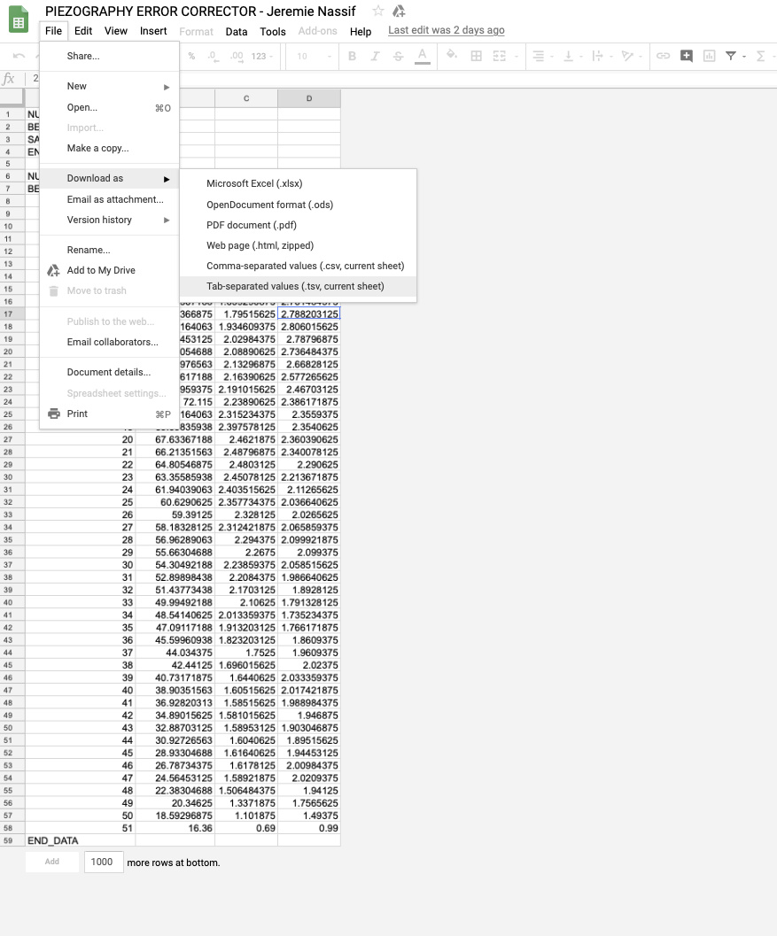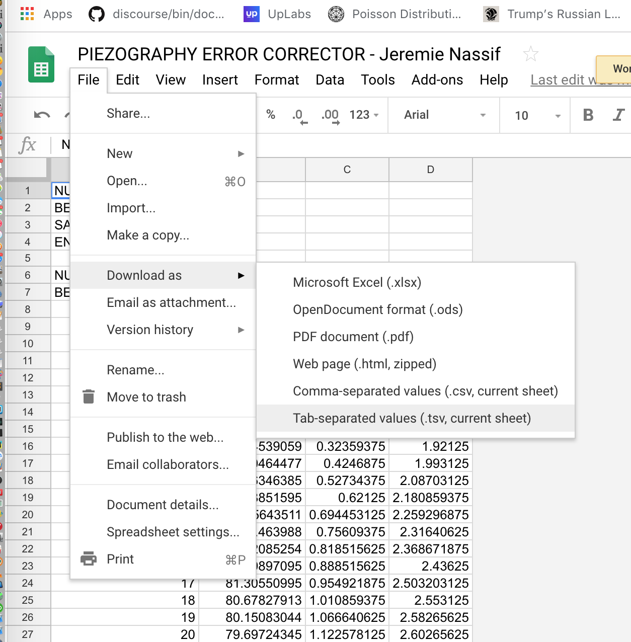 Ok. I see the problem. You went to the File menu of your browser app. Instead you need to go to the File menu inside of google spreadsheets and download sheet as tsv.