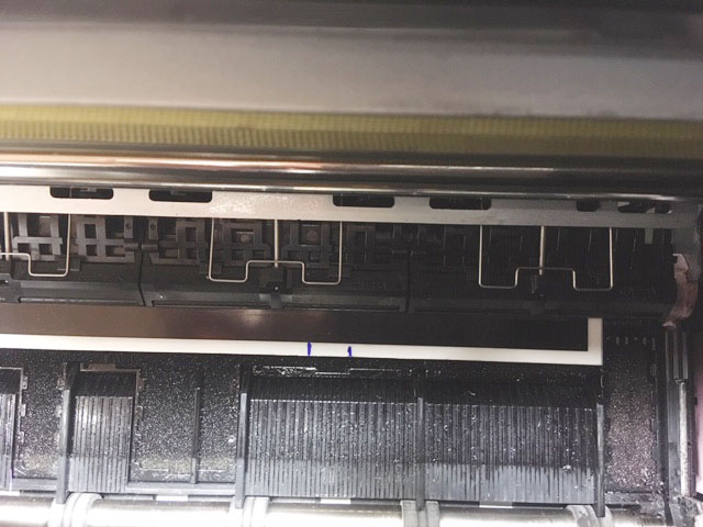 I marked (in blue pen) the location of the problem band and fed it into the printer. (Printer head has been moved off to the side.)