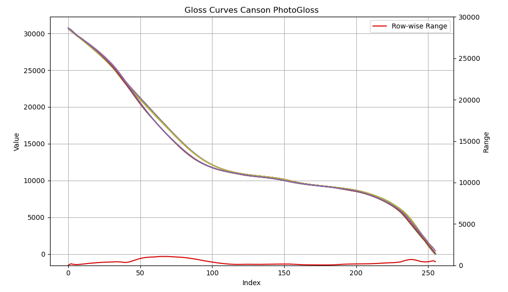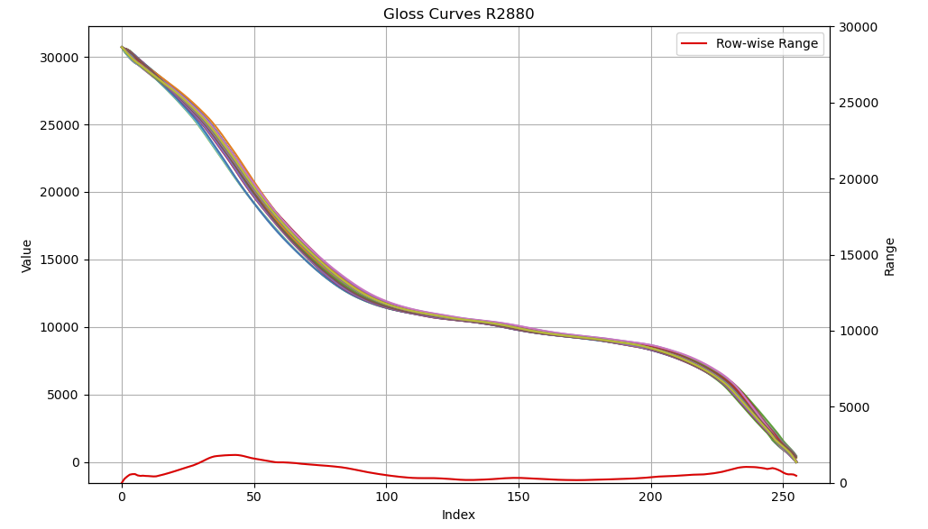 All gloss curves for the R2880 printer; the max–min value for each column is shown in red.