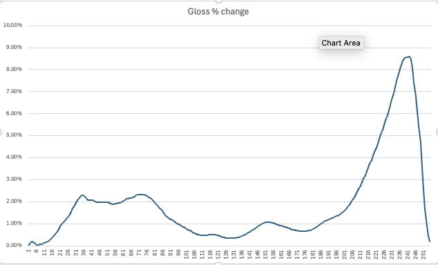 In the image above, I plotted the difference for Epson Premium Gloss paper and converted it into %. My question is: should gloss be scaled at all?