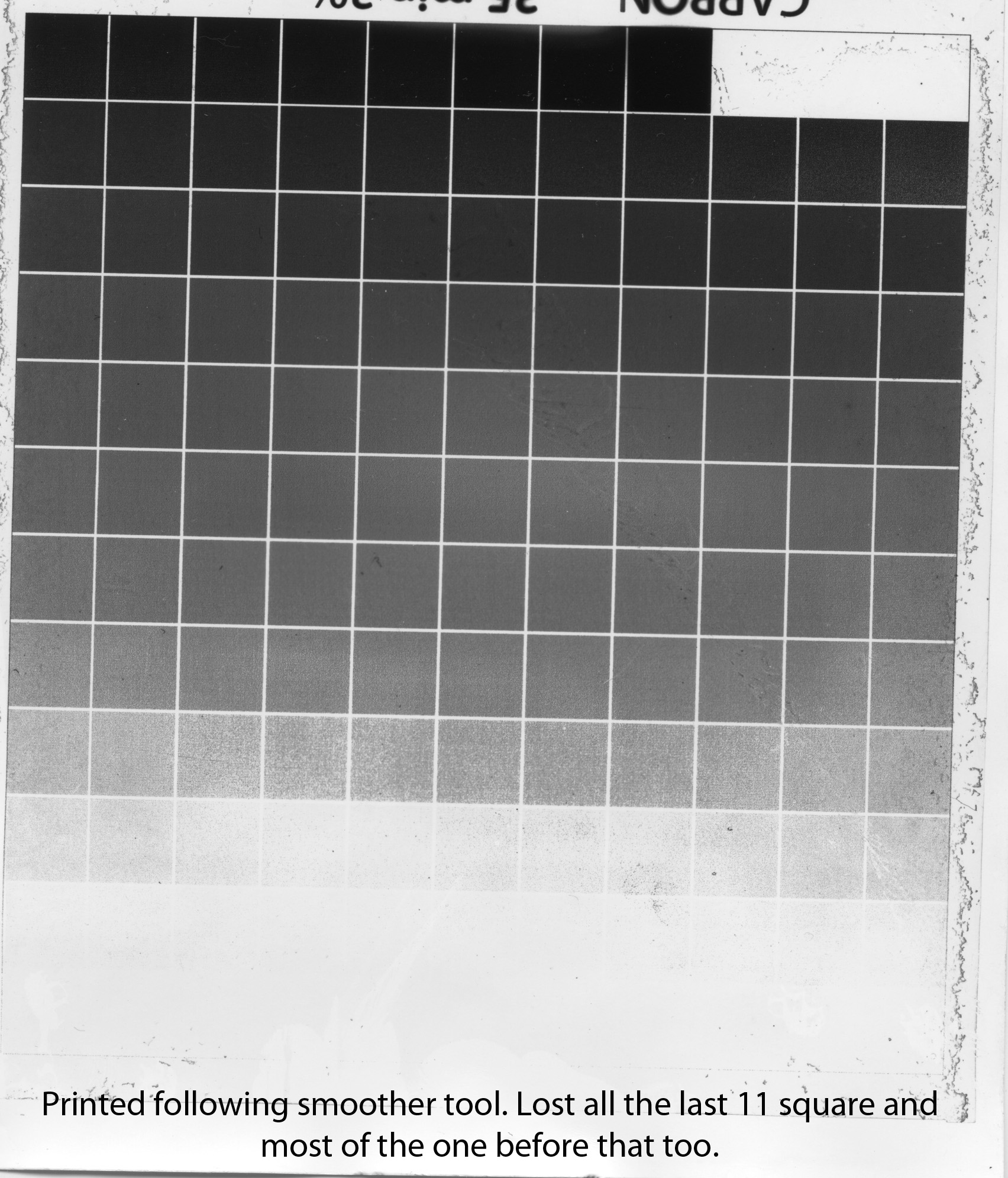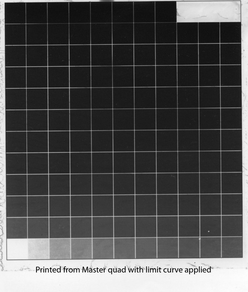 First it printed a limiter negative using the master quad and then determine a limit point and developed and new quad using that. The first image is made using that quad. Once that print was made I measured the 129 steps and ran it through the smoother to make another quad and then reprinted the 129 step wedge and the second image is the result. I seem to have gained a lot of the missing tones which were missing from the first but lost the last 22 steps, or most of them.